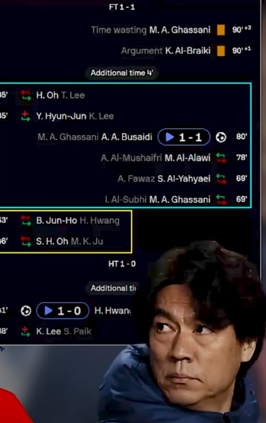 - 오만전에서도 전반전에서 부진 → 하프타임 교체