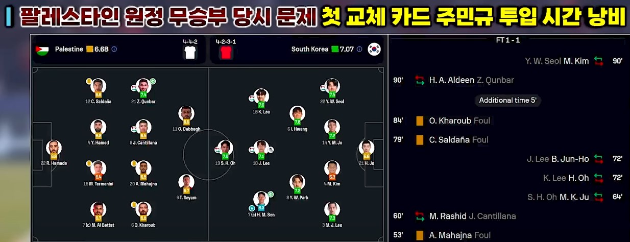 - 팔레스타인전에서도 선발 기용 → 경기력 저하 원인